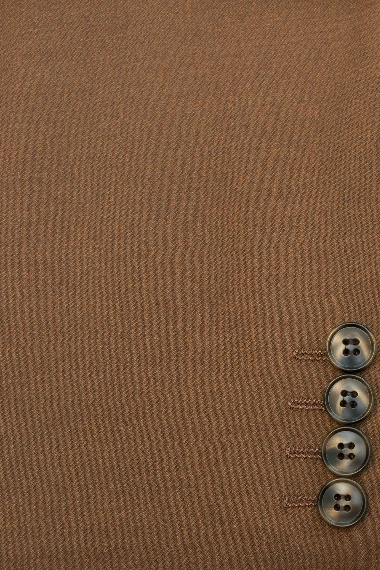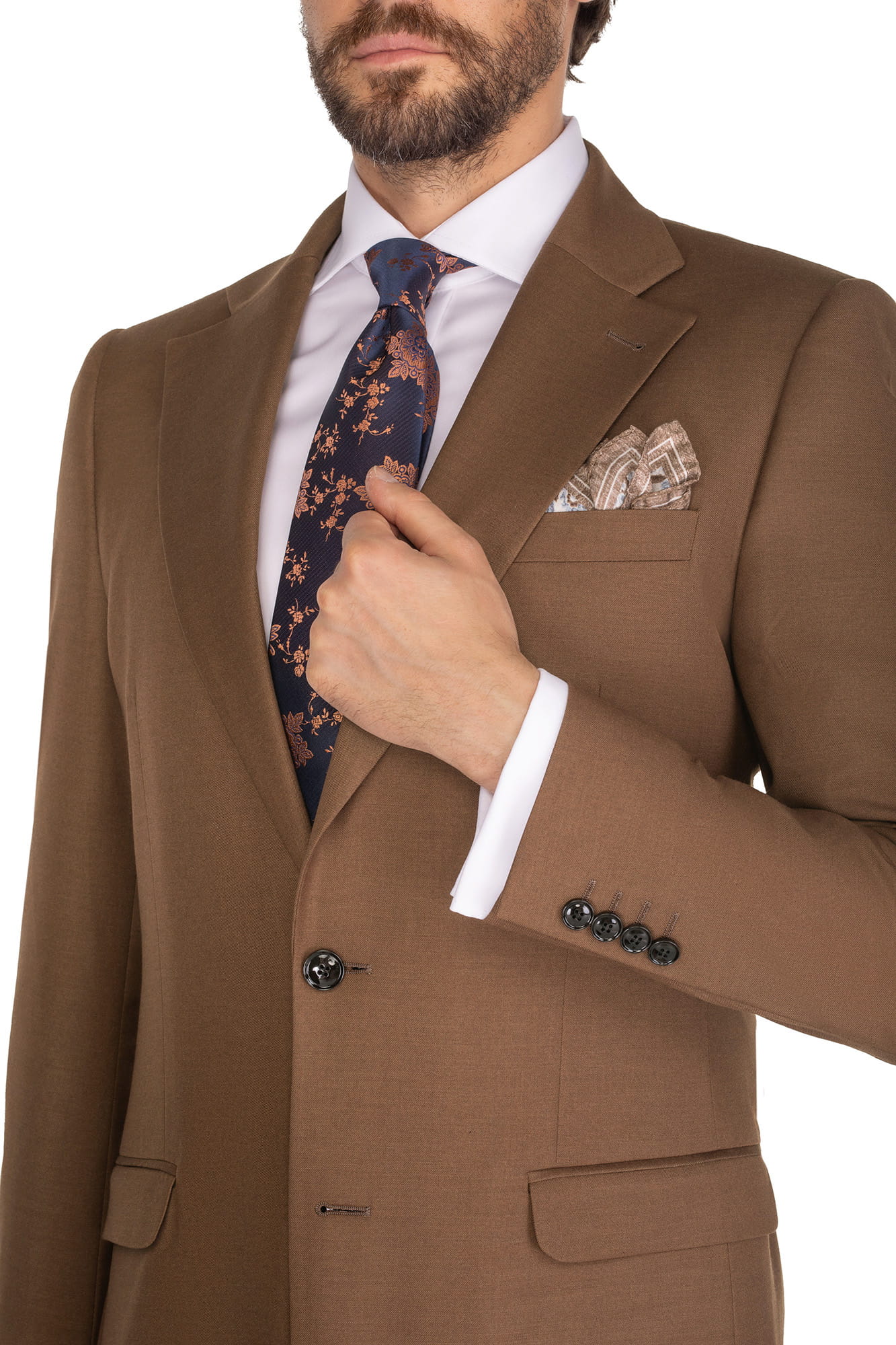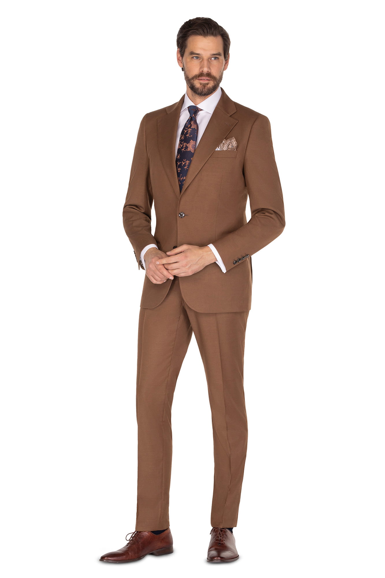 Garnitur Nevada, to jasno brązowy, gładki garnitur uszyty w nowoczesnej formie. Zestaw dwuczęściowy składający się z marynarki i spodni.